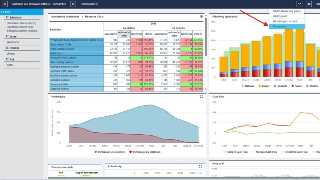 Dynamická prezentace přímo na poradě Na poradě jen spustím dashboard v prezentačním režimu a přecházím mezi slidy. Přitom mohu měnit ukazatele, období, dimenze na osách tabulek, nebo rozpadat hierarchie. Prezentace tak není statická, ale živá a přizpůsobivá.